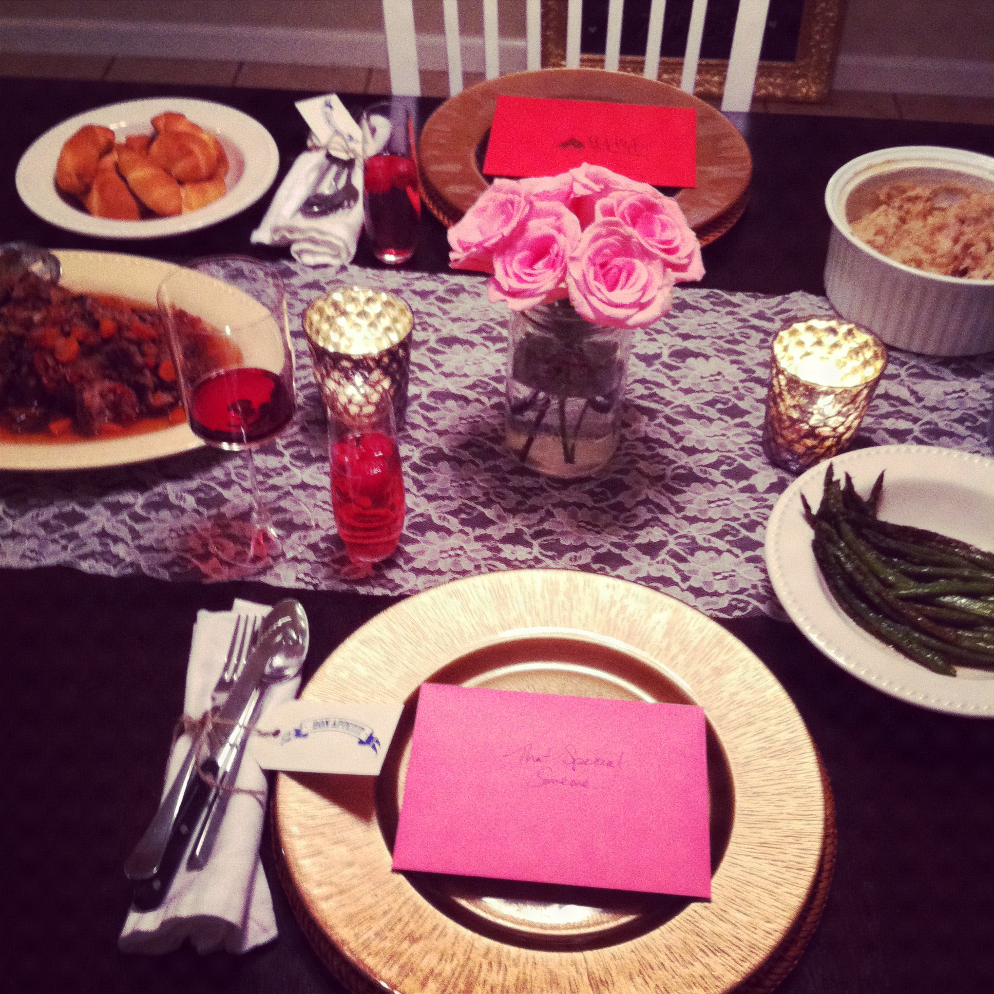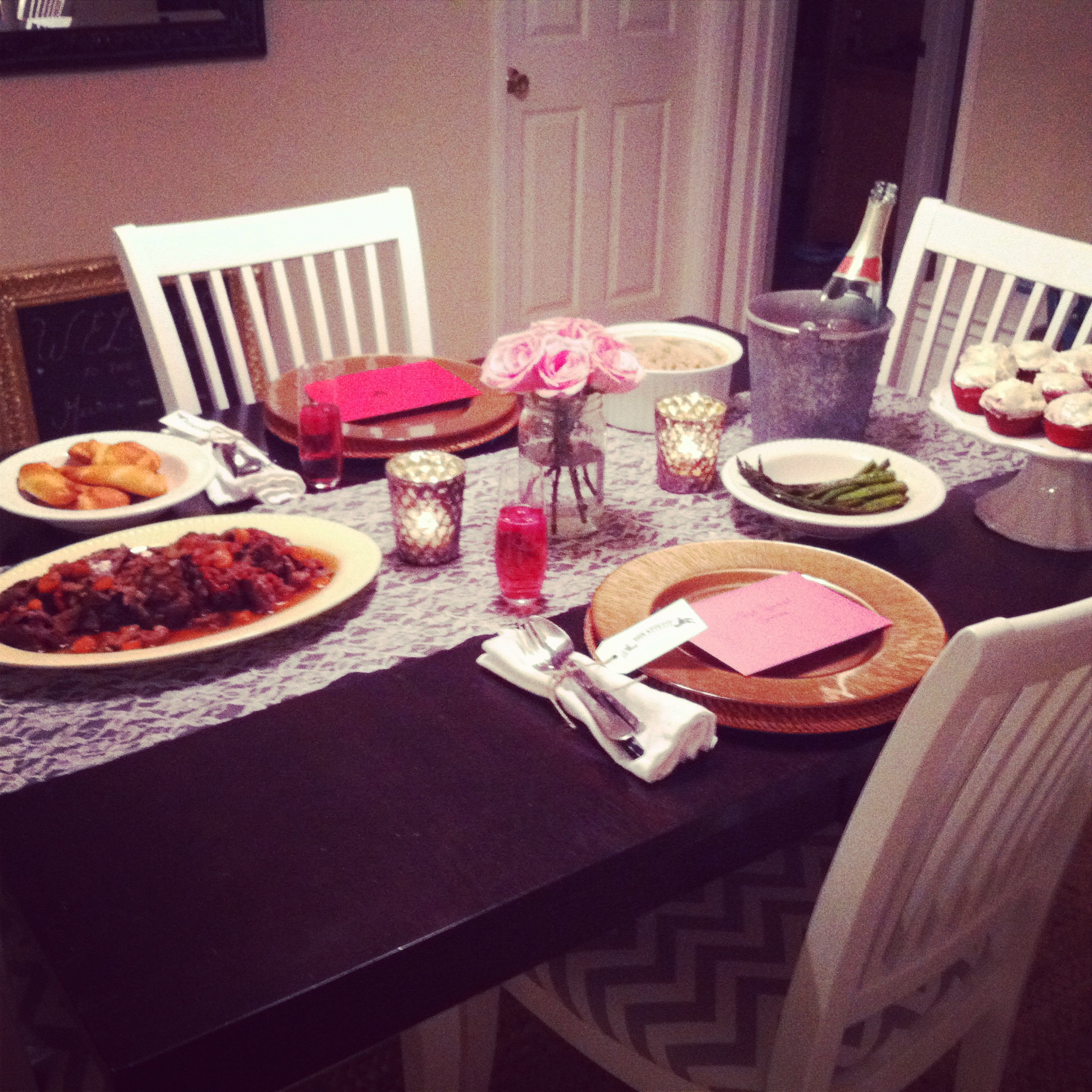 We made short ribs + veggies (slow cooked for 8 hours), shallot mashed potatoes, asparagus, crescent rolls (my fav) and pink champagne! For dessert: homemade carmel heath bar crunch gelato + red velvet cupcakes.
