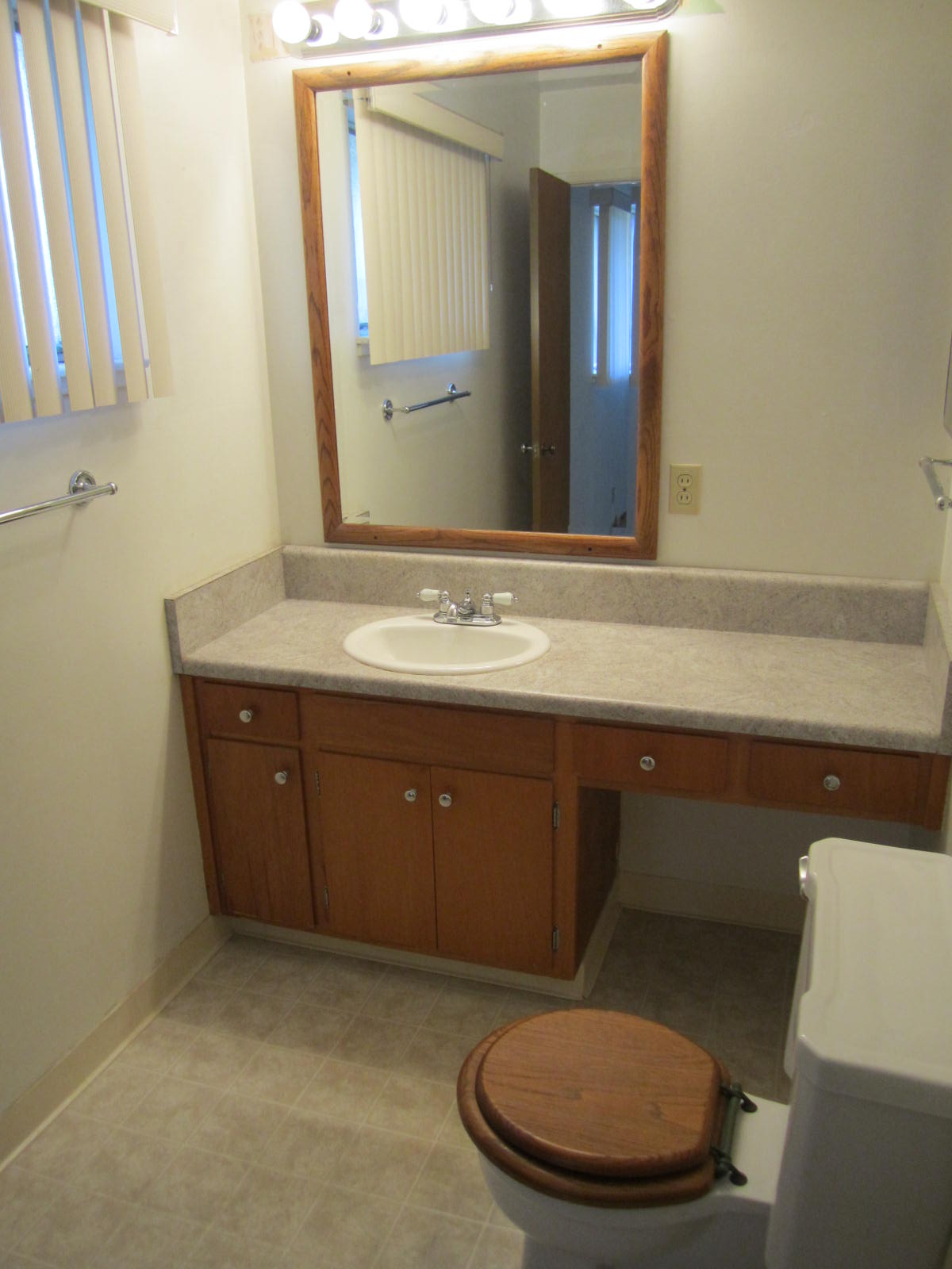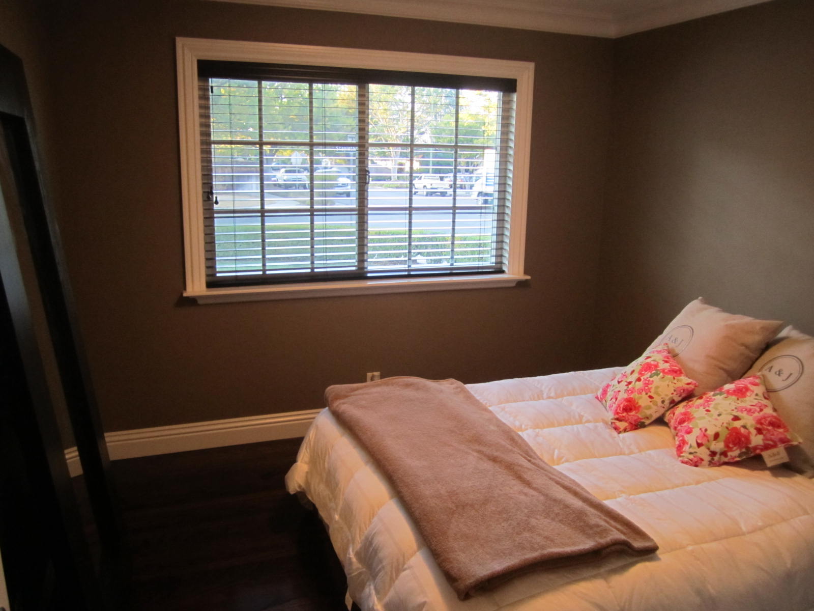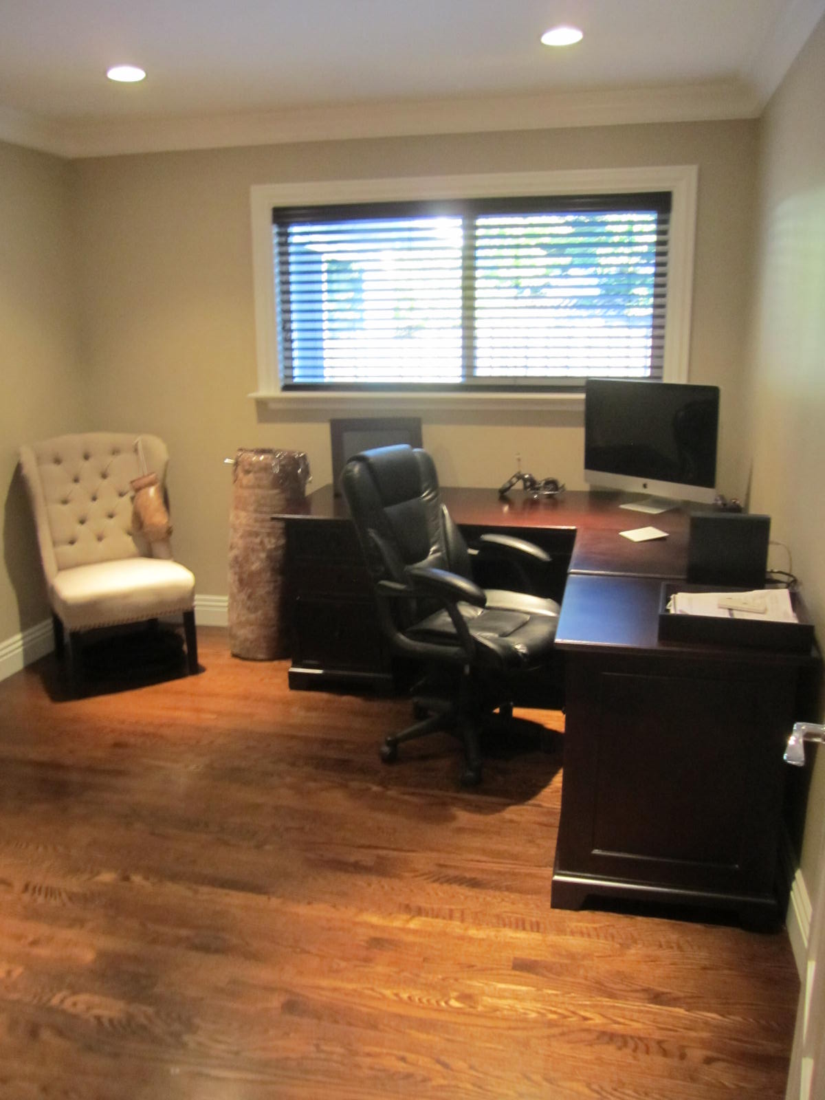 Oak hardwood with and espresso finish through out- Travertine Hearth & surround