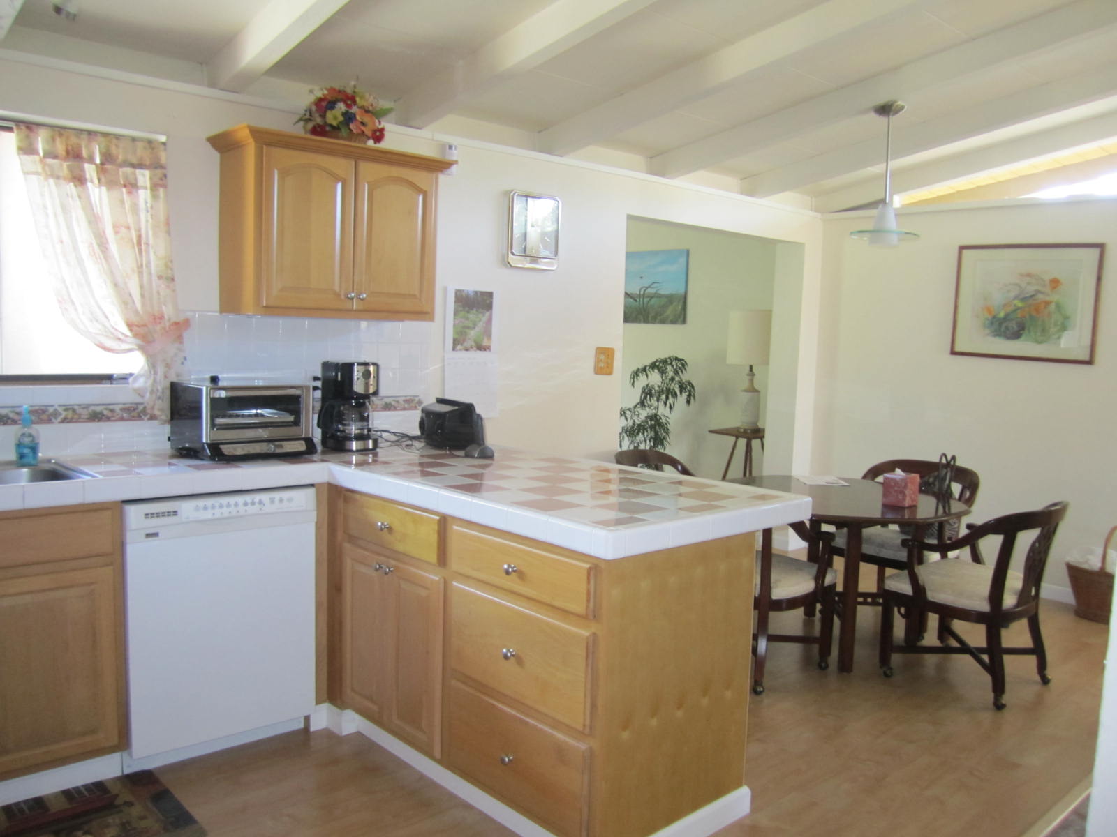 Stunning open beam ceilings, and laminate wood flooring, ceiling fans, dual pane windows and central A/C & heating throughout the home