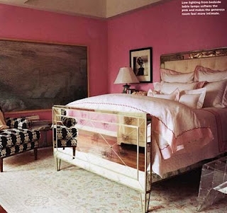 Bold pink walls & neutrals. The mirrored bed – to die for.