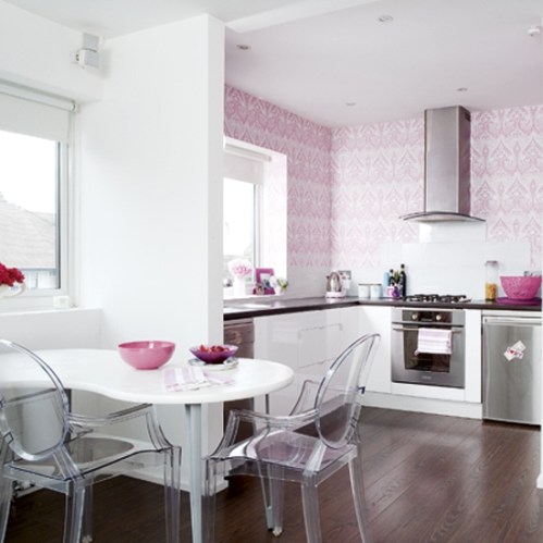 Wallpapered pink kitchen & ghost chairs. Again super unexpected, yet amazing if done right.