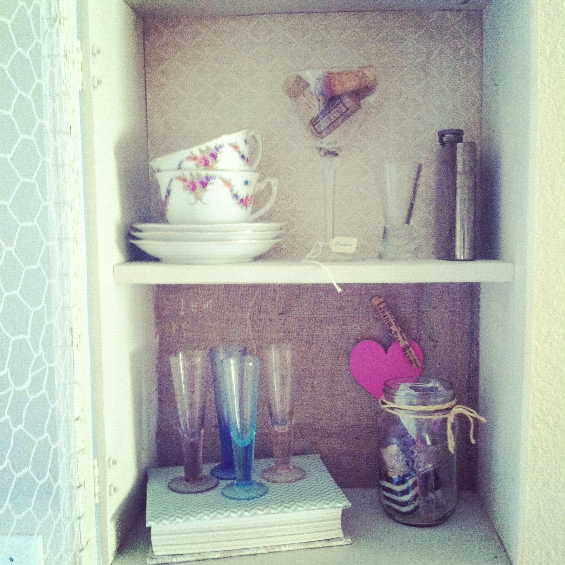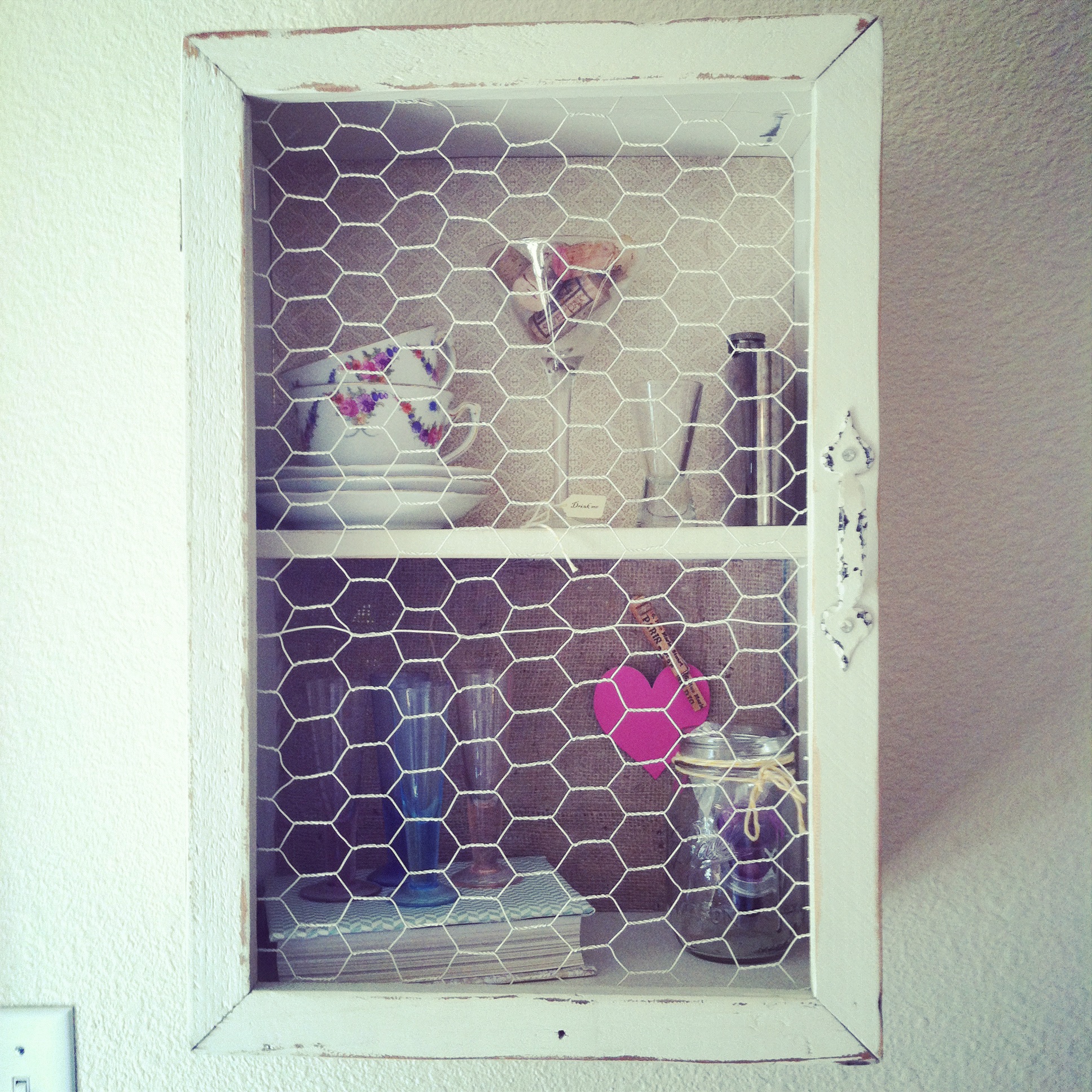 I spray painted the vintage milk bottle my mom gave me (she was about to throw them out!) The wood flowers are from my wedding bouquet